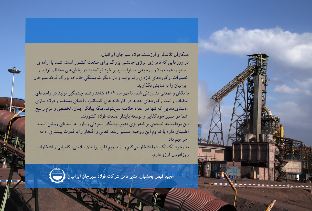 در روزهایی که ناترازی انرژی چالشی بزرگ برای صنعت کشور است، شما با ارادهای استوار، همت والا و روحیهی مسئولیتپذیر خود توانستید در بخشهای مختلف تولید و تعمیرات، رکوردهای تازهای رقم بزنید و بار دیگر شایستگی خانواده بزرگ فولاد سیرجان ایرانیان را به نمایش بگذارید.
